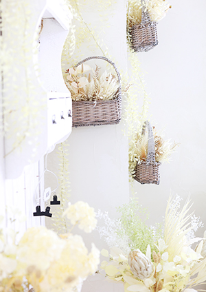 暖かみのあるベージュ系のお花を飾った、