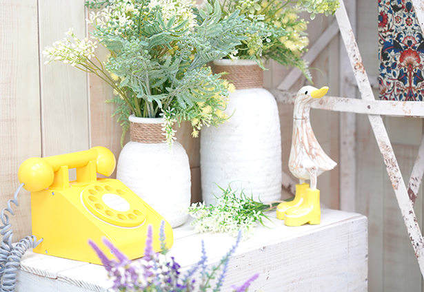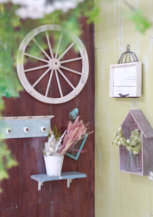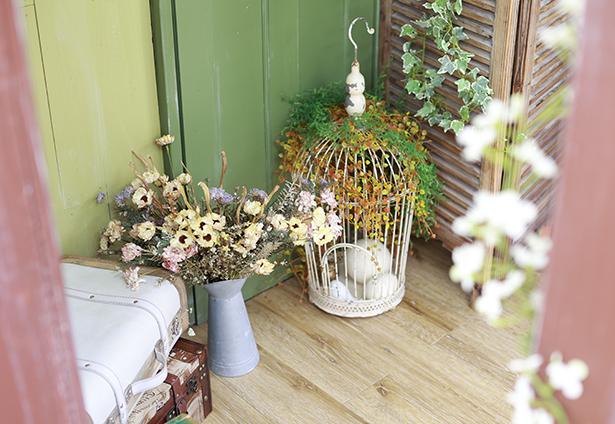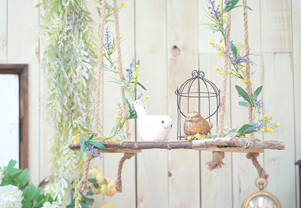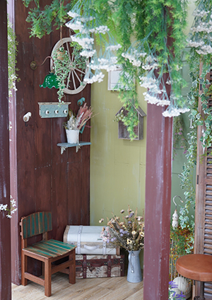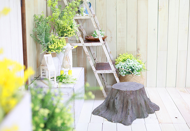 手作りの切り株イスや花籠などの小物で